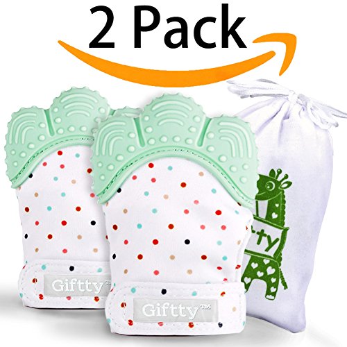 Giftty teething mitten features the food-grade soft silicone, crinkle sound, adjustable velcro strap, helps baby entertains self and relieve teething sore gums and protects baby from scratching.