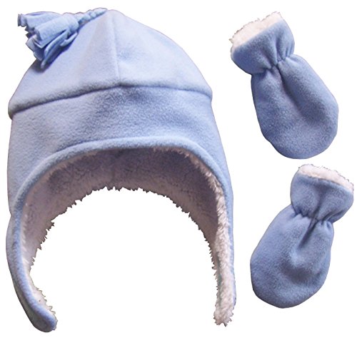 N’ice Caps boys soft sherpa lined micro fleece pilot style hat and mitten set. The softest for warmth and comfort. Velcro chin strap on hat, hanging tassels, elastic on mitten wrist. 5 colors. Black, navy, royal, charcoal grey, red, lt blue. 4 sizes. One size fits 3-6 months, one size fits 6-12 months, one size fits 6-18 months, one size fits 1-2yrs (care label says 2T-4T,) one size fits 18-36 months, one size fits 3-5yrs, one size fits 3-6 years. Not all colors available in all sizes. Tested and approved as per CPSIA standards.