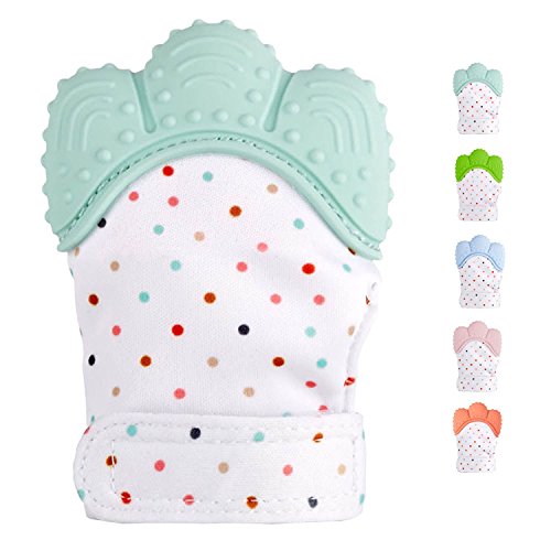 - ♥ ATTRACTIVE DESIGN – 5 different attractive colors for the top silicone teether, with the spot glove design, will let your teething baby love it. With Built-in phonic membrane, it can make a slight noise “zizi” sounding like candy being stripped off. We’re sure your baby will love it.