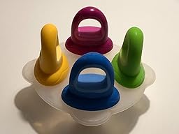 Das Set besteht aus 4 bunten Eisstielen und der Form in der das Eis dann gefroren wird. Die Griffe der Eisstiele sind so geformt, das auch schon kleine Babys sie gut greifen können.
