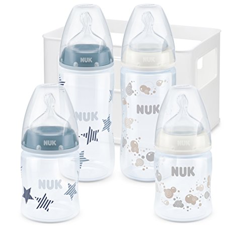 - Inklusive 4 NUK First Choice+ Weithalsflaschen (2x 150ml & 2x 300ml, 0-6 Monate) mit attraktiven Motiven und Farben für Jungen