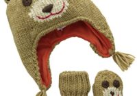 He’ll look adorable in this bear hat and mitten set Lining made of 100 percent microfleece; treated to prevent pilling 3D bear ears at top of hat Side flaps protect ears and have yarn tassels Contrast lining Bear face at hat and mittens
