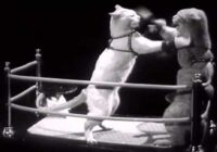 more at http://quickfound.net ‘CU newspaper headline cut-out superimposed over newspaper page, article headline “Doggy Crowd Gets Ringside Seats at Pussyweight Battle” Sign on wood fence with text painted as though in a child’s hand “Big Fight Tonight Admishun _ Pound Liver or 2 Bunches Catnip”, several dogs enters frame run past sign through gap in… Read More »