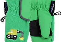 Toddler boy’s sport fleece and taslon mitten with embroidered designs has a side velcro tab for easy access, rubber tech palm patch and thinsulate insulation Fits Ages 2-4 Side velcro tab for easy access rubber tech palm patch Thinsulate insulation Embroidered design